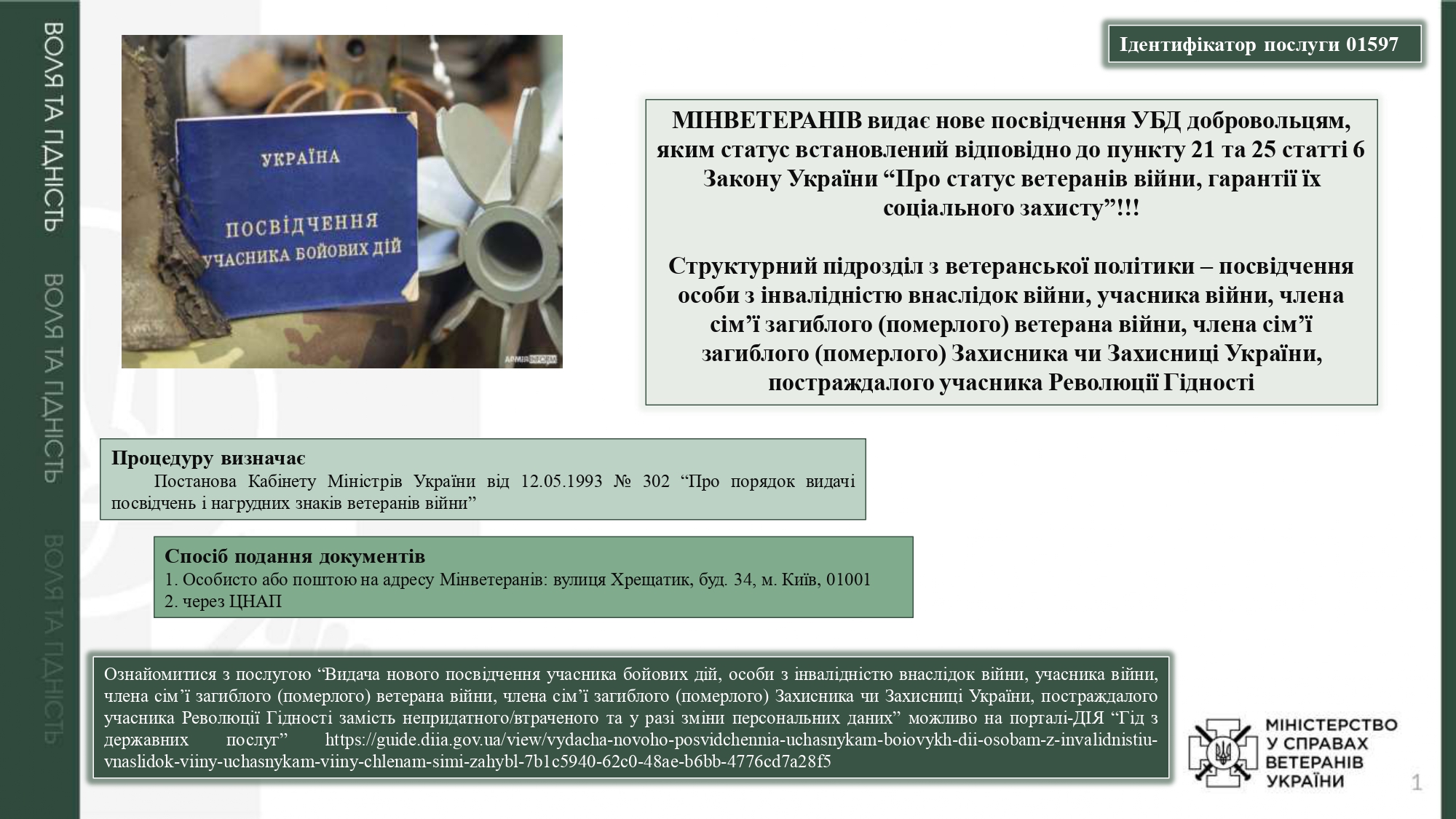 Мінветеранів України підготовлено роз'яснювальні матеріали щодо адмінпослуг. Видача нового посвідчення учасника бойових дій...