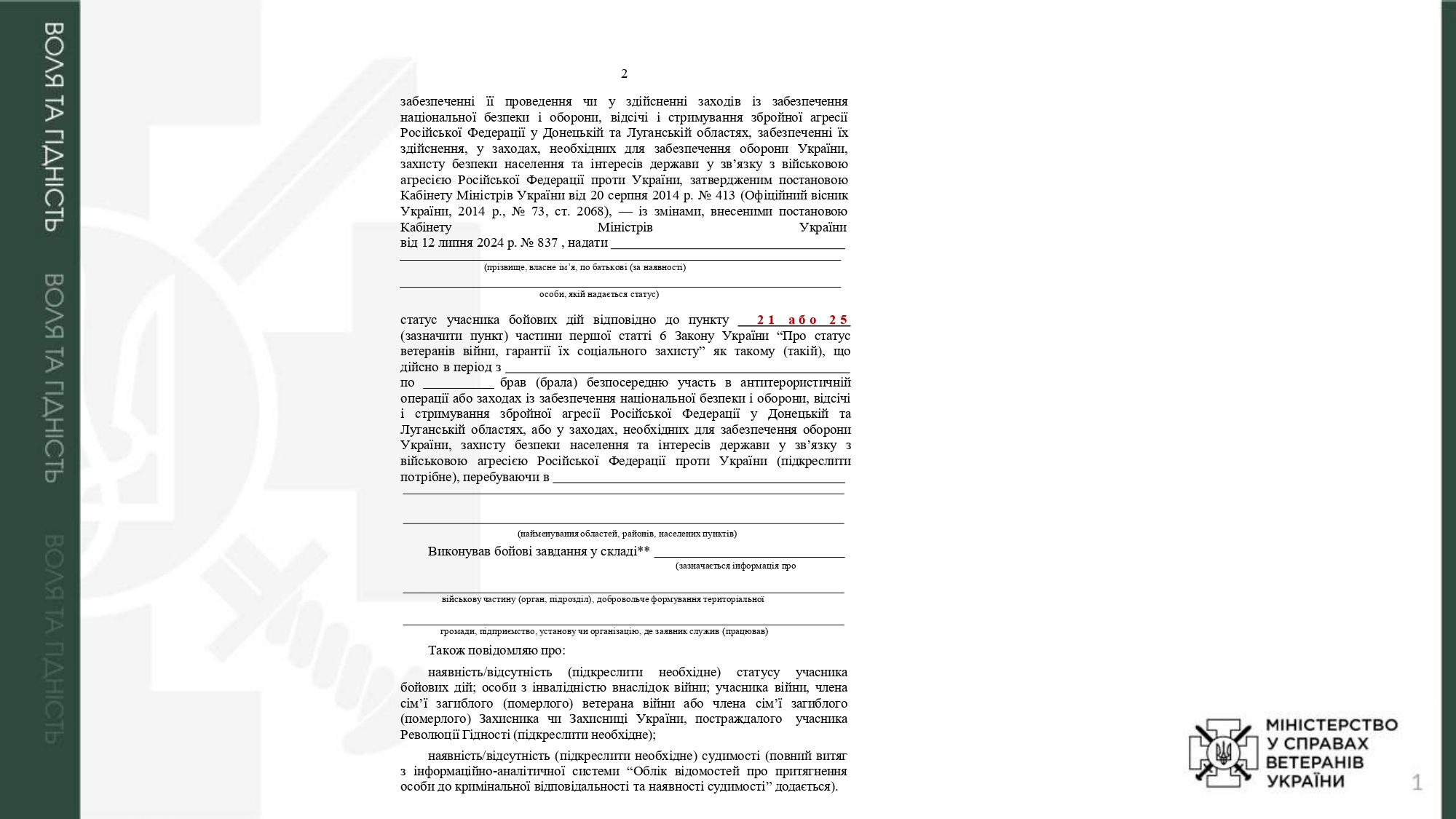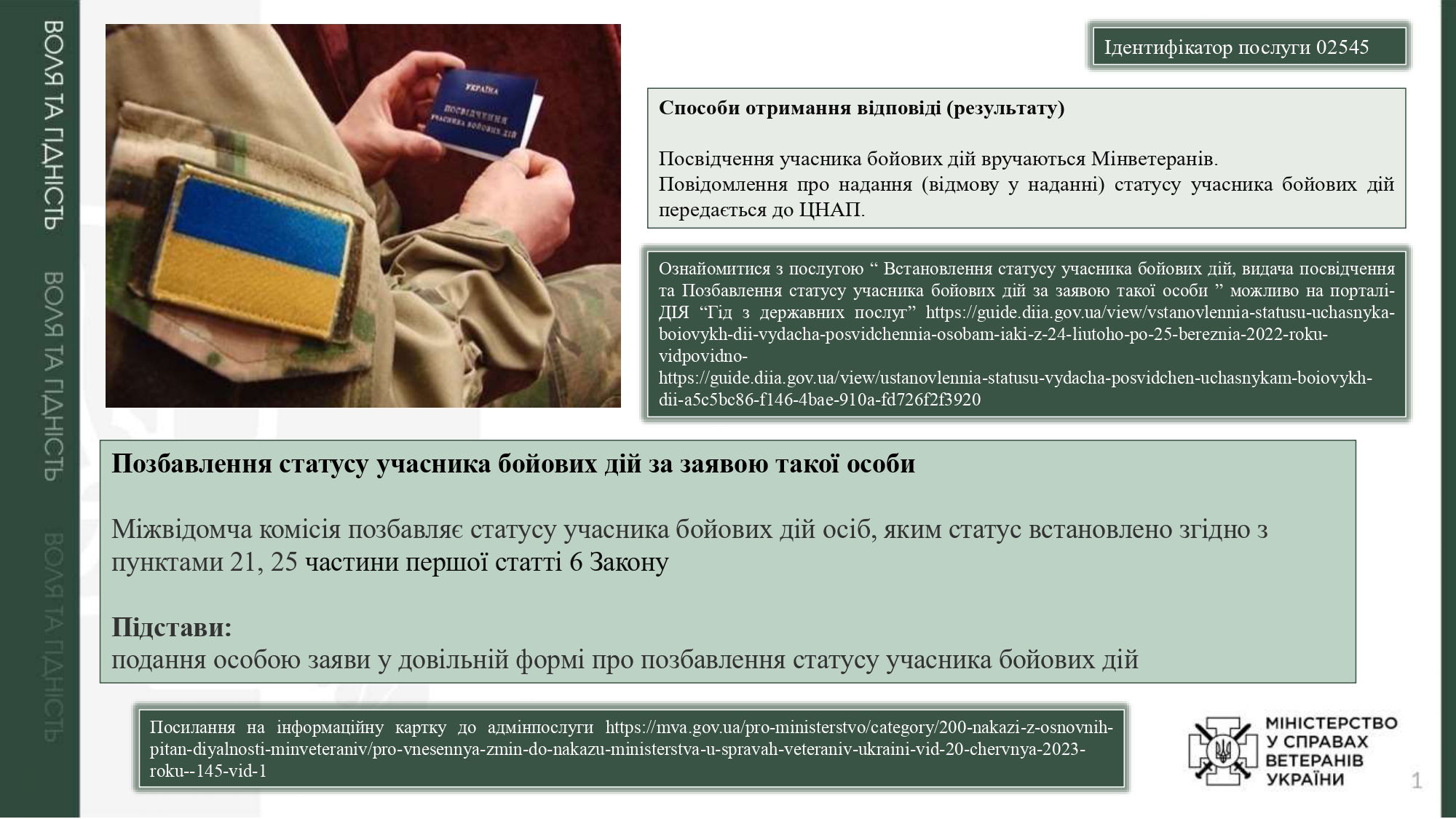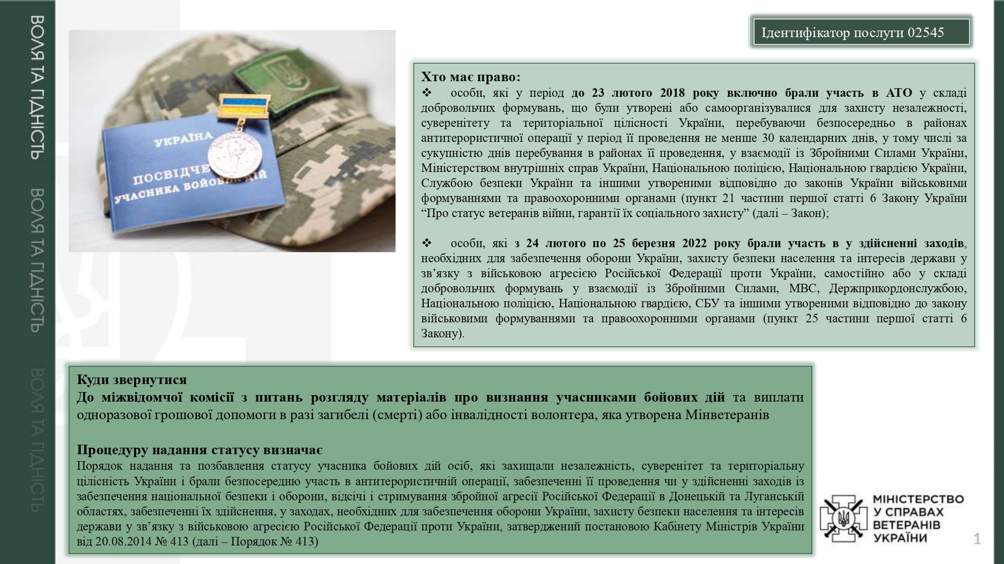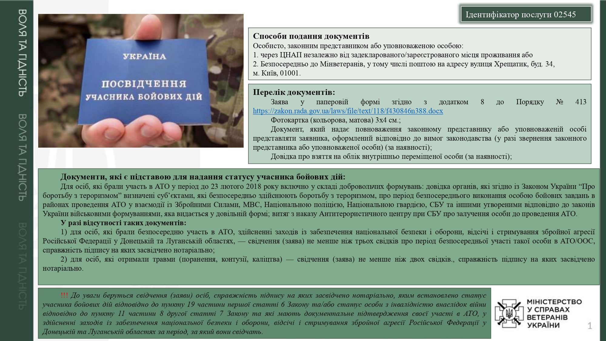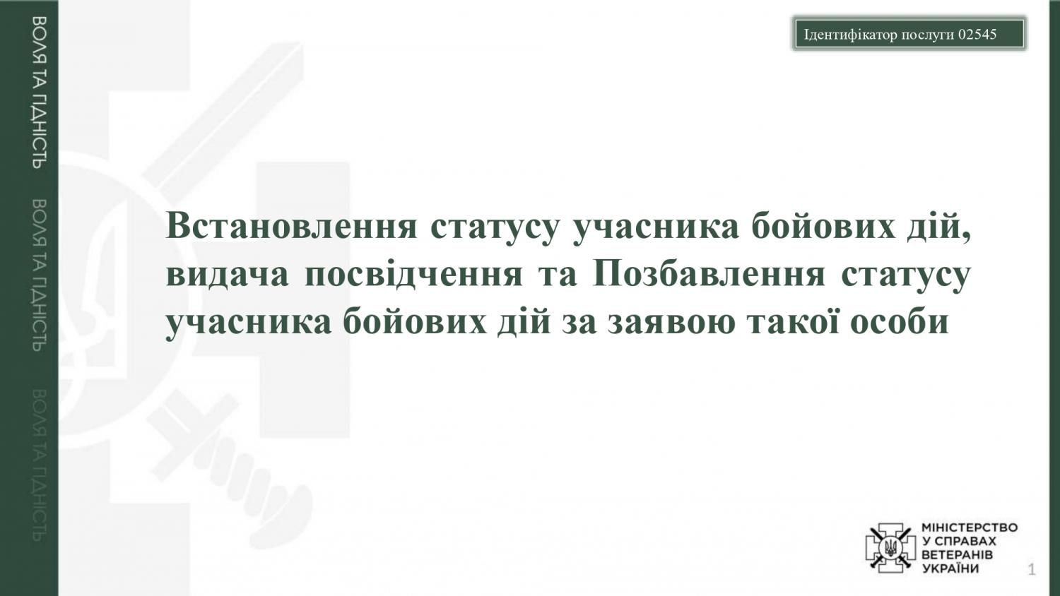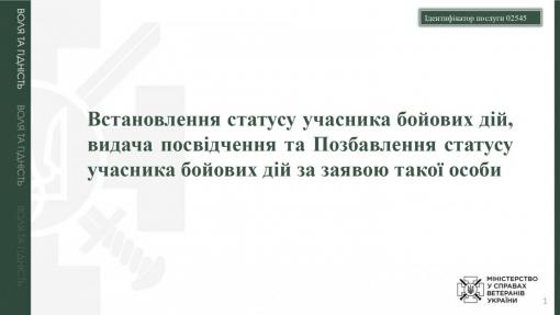 Мінветеранів України підготовлено роз'яснювальні матеріали щодо адмінпослуг. "Встановлення статусу учасника бойових дій, видача посвідчення