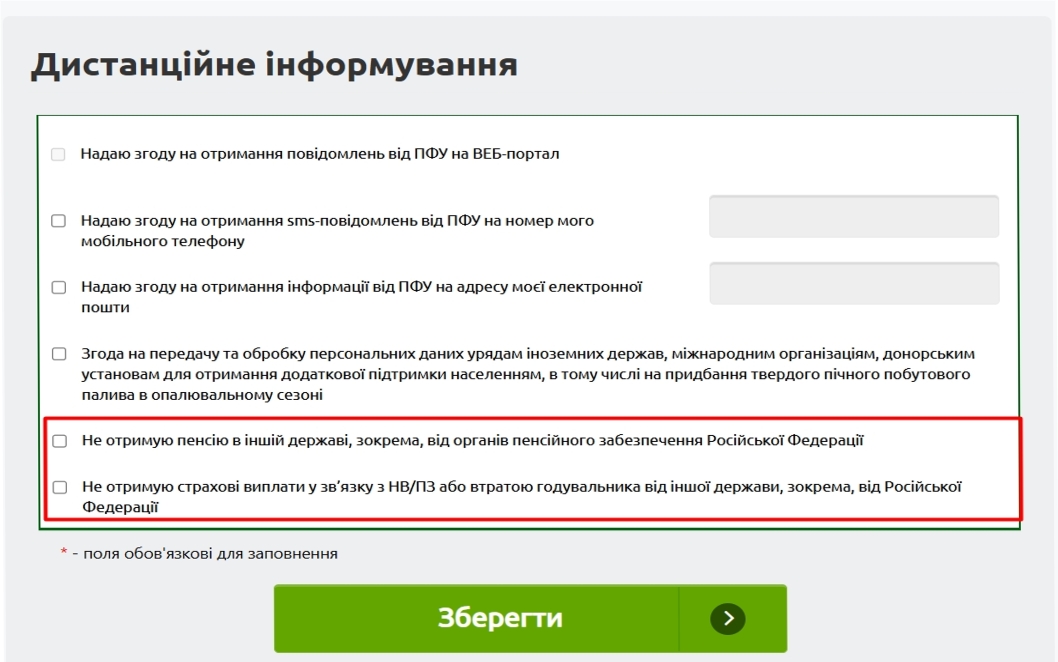 Відтепер форму доповнено позначками “Не отримую пенсію в іншій державі, зокрема, від органів пенсійного забезпечення Російської Федерації” та “Не отримую страхові виплати у зв’язку з НВ/ПЗ або втратою годувальника від іншої держави, зокрема, від Російської Федерації”.