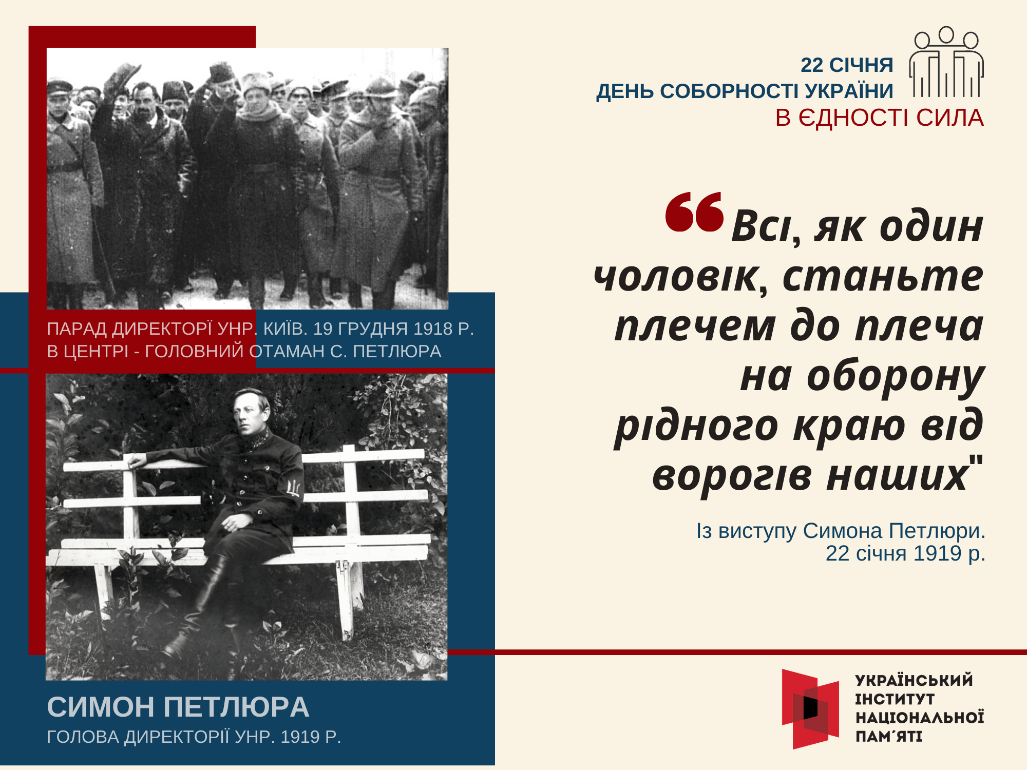 Проголошення Соборності 22 січня 1919 року, коли Українська Народна Республіка та Західноукраїнська Народна Республіка об’єдналися в соборну державу, увінчало прагнення до єднання українців, розділених кордонами тогочасних імперій. Ця подія повністю руйнує твердження російської пропаганди, буцімто українські землі вперше об’єднав Сталін у 1939 році.