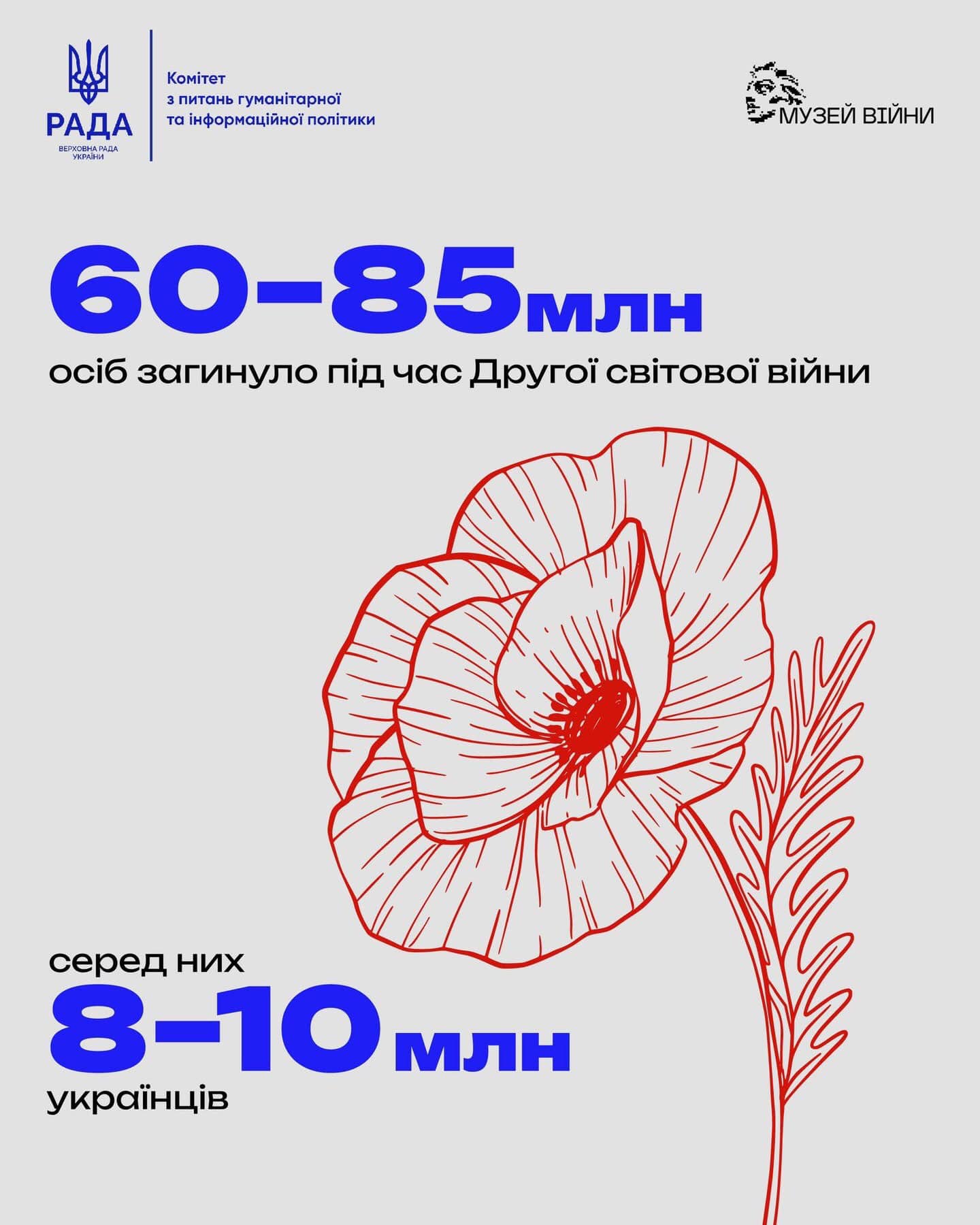 Цьогоріч Україна та світ відзначають 80-річчя завершення Другої світової війни. Українці зробили вагомий внесок у перемогу над нацизмом — у лавах антигітлерівської коаліції воювали близько 8 млн наших громадян. Втрати України становили від 8 до 10 млн осіб, більшість із яких — цивільні.