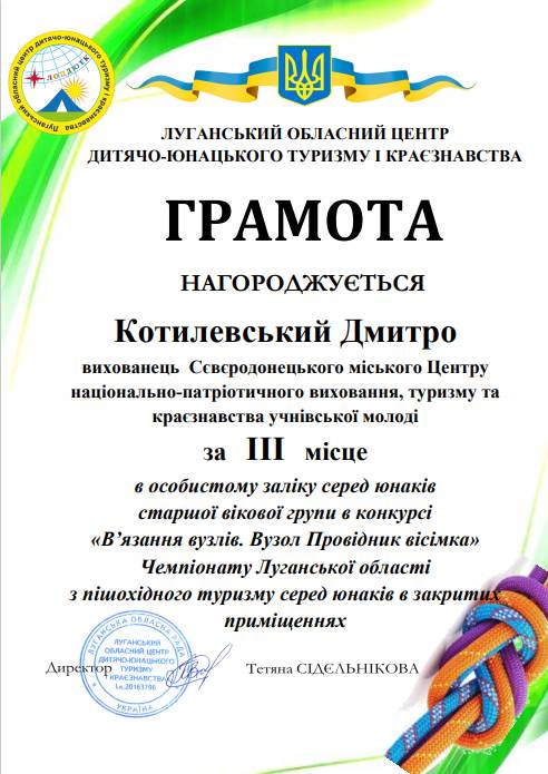 - Дмитро Котилевський - ІІІ місце в особистому заліку серед юнаків старшої вікової групи в конкурсі "В'язання вузлів. Вузол Провідник вісімка".