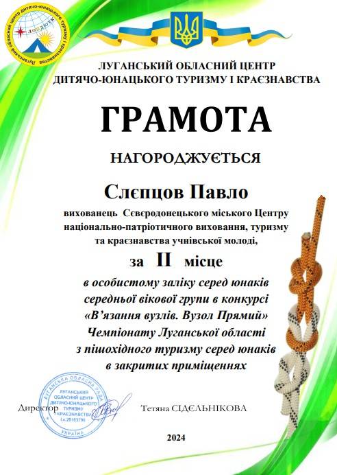 - Павло Слєпцов - ІІ місце в особистому заліку серед юнаків середньої вікової групи в конкурсі "В'язання вузлів. Вузол Прямий";