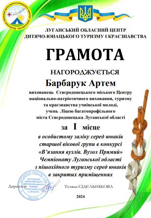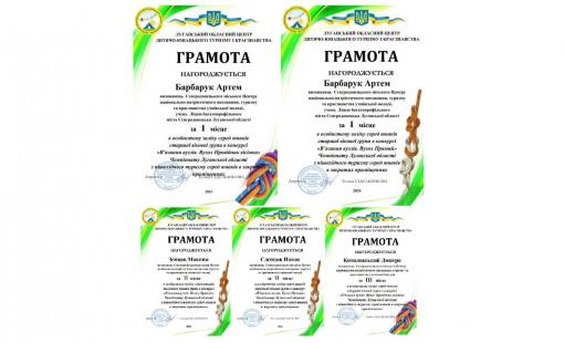 - Артем Барбарук - І місце в особистому заліку серед юнаків старшої вікової групи в конкурсі "В'язання вузлів. Вузол Прямий";