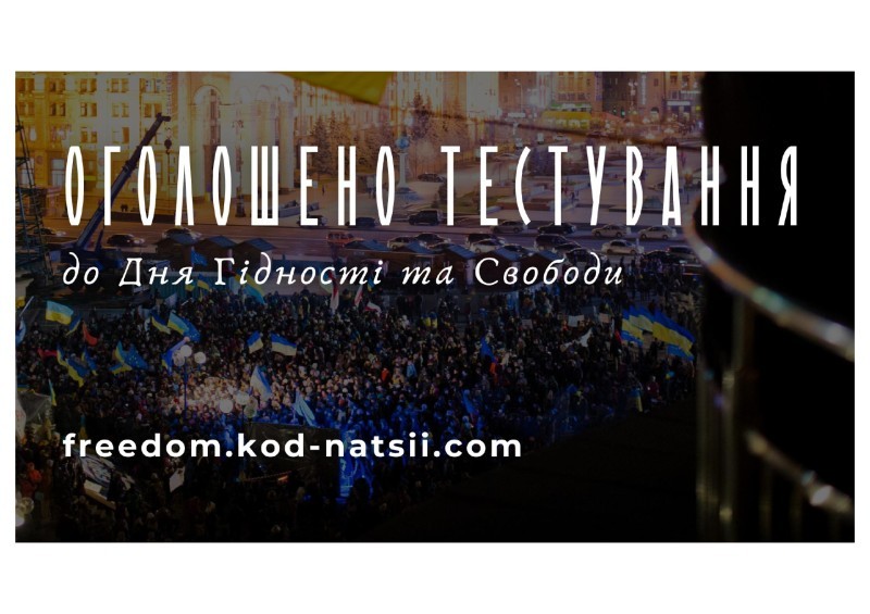 Освітньою платформою Національного Фестивалю “Код Нації” оголошується проведення Тестування до Дня Гідності та Свободи, яке покликане поглибити розуміння учасниками історичної значущості Революції Гідності, стимулювати інтерес до вивчення української історії та формування свідомої громадянської позиції в сучасному українському суспільстві. Методичне забезпечення Тестування здійснюється Освітньої платформою Фестивалю.