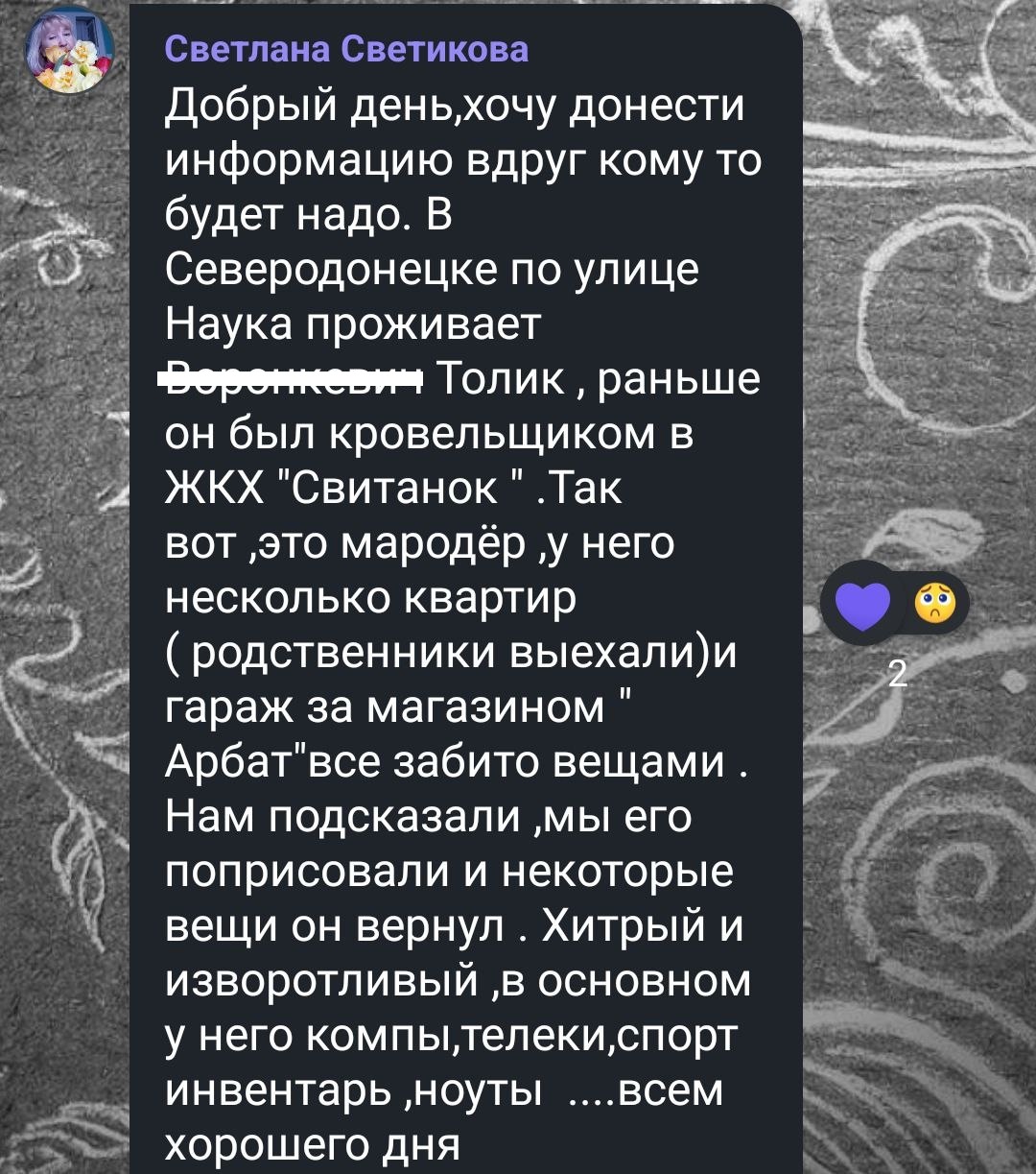 "Доброго дня, хочу донести інформацію, раптом комусь буде треба. У Сєвєродонецьку по вулиці Науки проживає Воронкевич Толік, раніше він був покрівельником у ЖКГ "Світанок". Так от, це мародер, у нього кілька квартир (родичі виїхали) та гараж за магазином "Арбат" все забито речами. Нам підказали, ми його попресували і деякі речі він повернув. Хитрий та спритний, здебільшого у нього комп'ютери, телевизори, спорт інвентар, ноути...", - поділилася сєвєродончанка у групі "Сєвєродонецьк. Нові райони” у Viber.