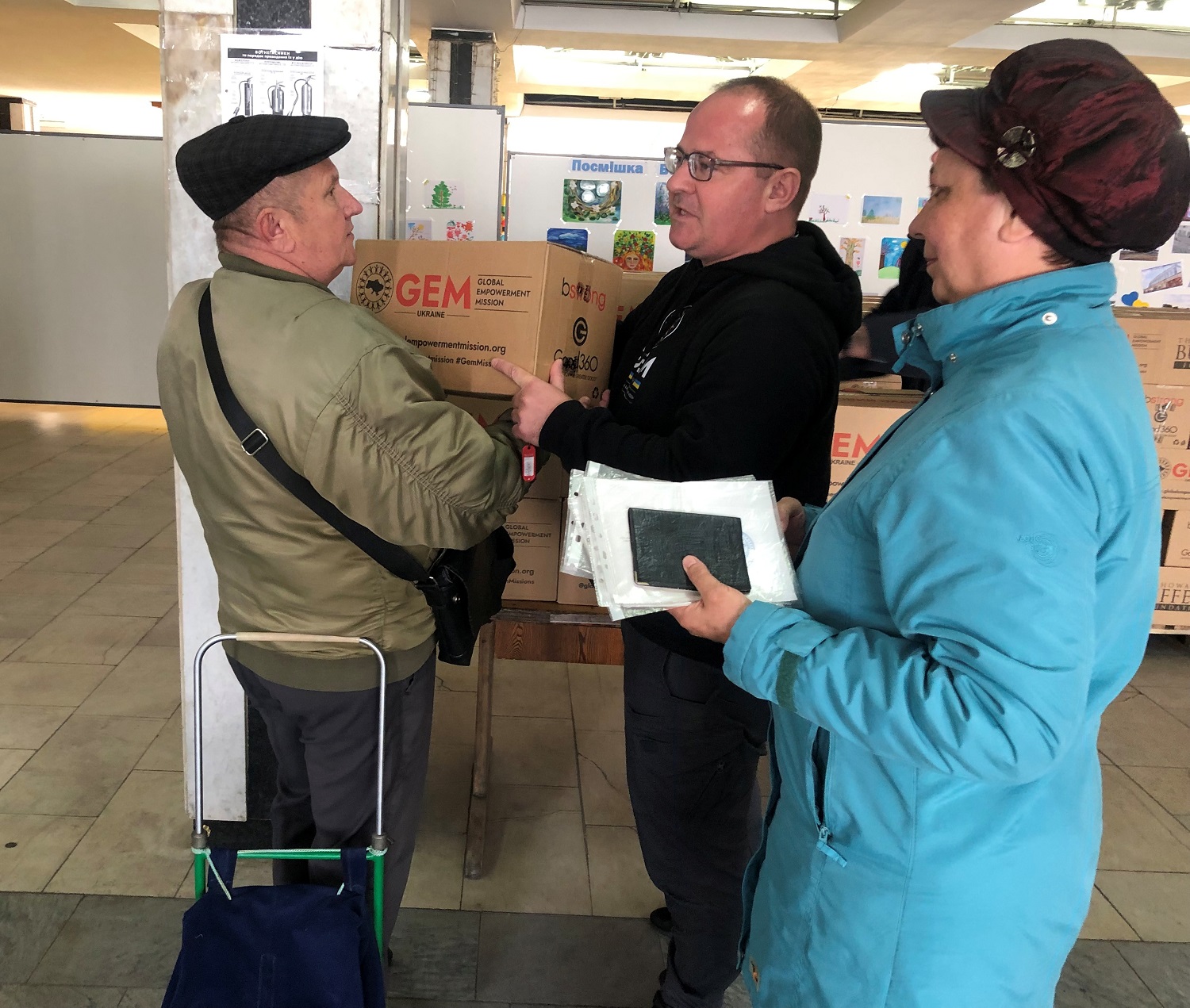 «По нас дуже пройшлася війна… все розбито… поїхали з сумкою та котом...», - діляться історіями між собою мешканці Луганської області, які прийшли за сімейними наборами від GEM.