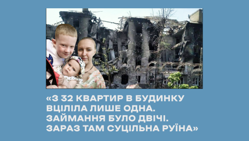 “Відчуття дому створює не тільки сама квартира, а двір, магазини, парки та навіть звичайна дитяча гірка, на якій ти катався у дитинстві. Все це разом і робить це місце особливим, — пригадує Настя. — Двору, де пройшло моє дитинство, більше немає. Всі навколишні будинки зруйновані, все завалено брухтом, усюди вирви від снарядів. Передивляючись старі фото та відео, я не вірю, що це місце знову може стати таким, яким було. Цей двір був особливий не тільки для мене, а й для мого сина. Саме тут він прочитав мені свій перший вивчений вірш — на фоні мого будинку, який невдовзі вже не існуватиме. Це було 1 березня 2022 року, тобто вже після початку російського вторгнення”.
