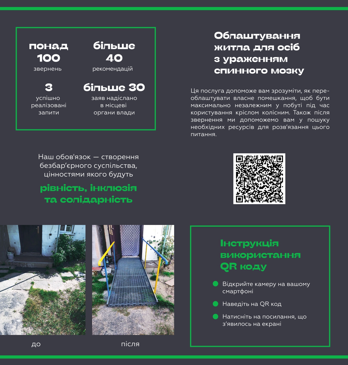 ГО “Група Активної Реабілітації”, яка з 2008 року працює для того, щоб люди, які отримали ураження спинного мозку, могли якомога швидше повернутися до максимально незалежного й вільного життя, почуватися гідно та користуватися своїми правами й свободами нарівні з усіма, пропонує до перегляду інформаційні матеріали про послугу з облаштування безбар’єрного житла.