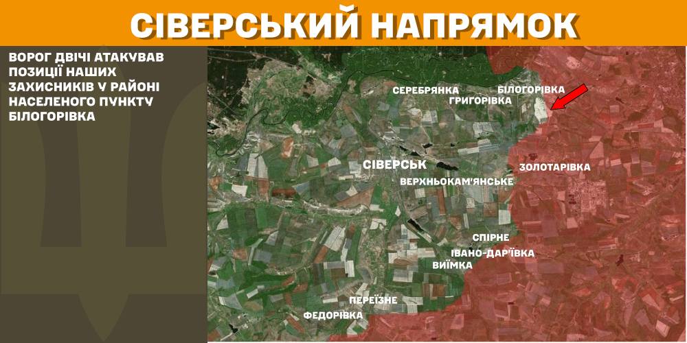 Два рази на Сіверській ділянці фронту загарбники намагалися просунутися в Білогорівці. На Лиманській – здійснили спроби наступу біля Греківки та Новолюбівки. У смузі нашої відповідальності противник продовжує активно застосовувати як артилерію, так і дрони. Зокрема, за учора бойові завдання виконували 142 ворожих безпілотники.