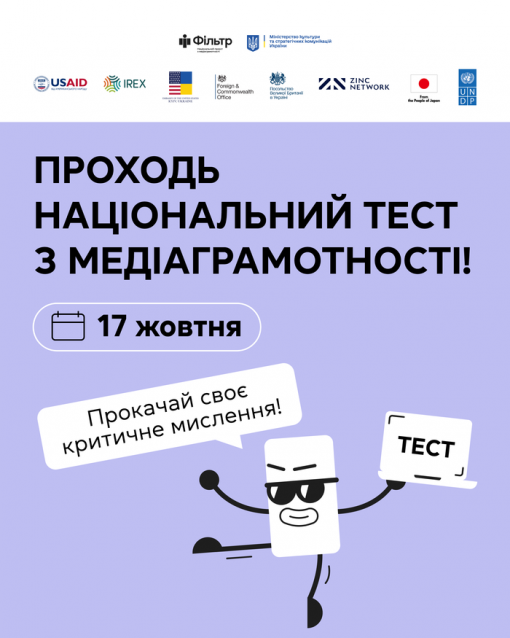 Вже третій рік поспіль у жовтні , напередодні Глобального тижня медіаграмотності, національний проєкт з медіаграмотності «Фільтр» Міністерства культури та стратегічних комунікацій України, спільно з програмою USAID «Мріємо та діємо», IREX, ПРООН в Україні та Zinc Network організовує національний тест з медіаграмотності. Перевіряйте, наскільки ви стійкі до маніпуляцій та дезінформації, та вигравайте корисні подарунки!