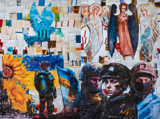 Ці колажі, кажуть організатори, розповідають про найсокровенніше - стосунки з Богом. Утім, відбиток повномасштабної війни на них добре помітний.
