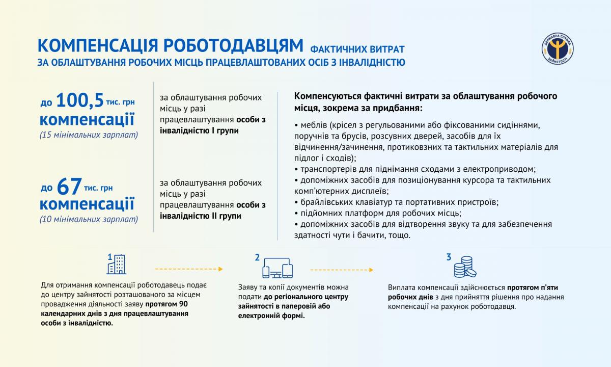 Сума компенсації не перевищує 100,5 тис. грн – за робоче місце особи з інвалідністю І групи та 67 тис. грн – за облаштування робочих місць для людей з інвалідністю ІІ групи.