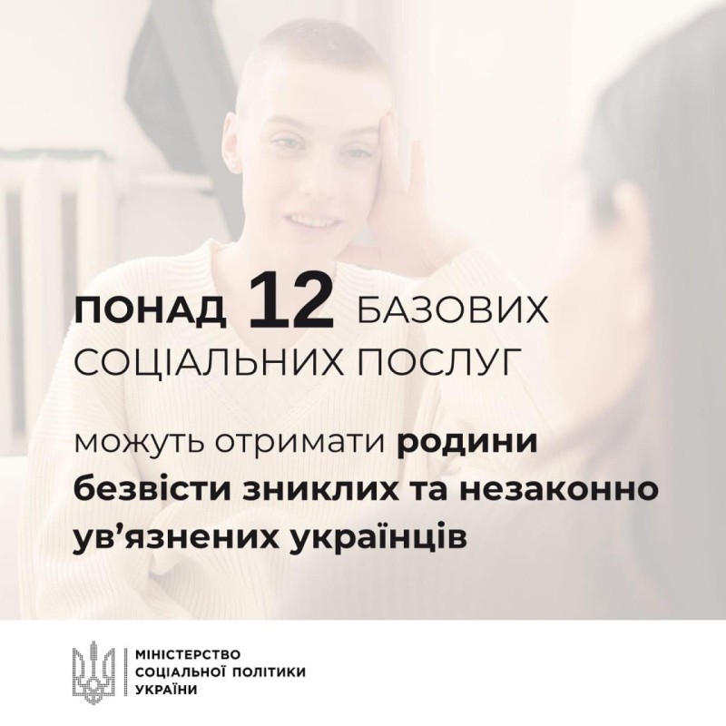 Своєю чергою Міністерство соціальної політики пропонує 12 першочергових соціальних послуг та програм підтримки для родин, які очікують рідну людину з полону або ж чиї рідні вважаються зниклими безвісти.