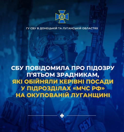 СБУ повідомила про підозру п’ятьом зрадникам, які очолили різні структурні підрозділи окупаційного «мчс лнр» у Сіверськодонецьку, Лисичанську, Рубіжному.