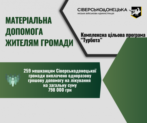 На виконання заходів Комплексної цільової програми Сєвєродонецької міської територіальної громади «Турбота» на 2025 рік виплачено одноразову грошову допомогу ще 259 мешканцям громади на лікування на загальну суму 798 000 грн.
