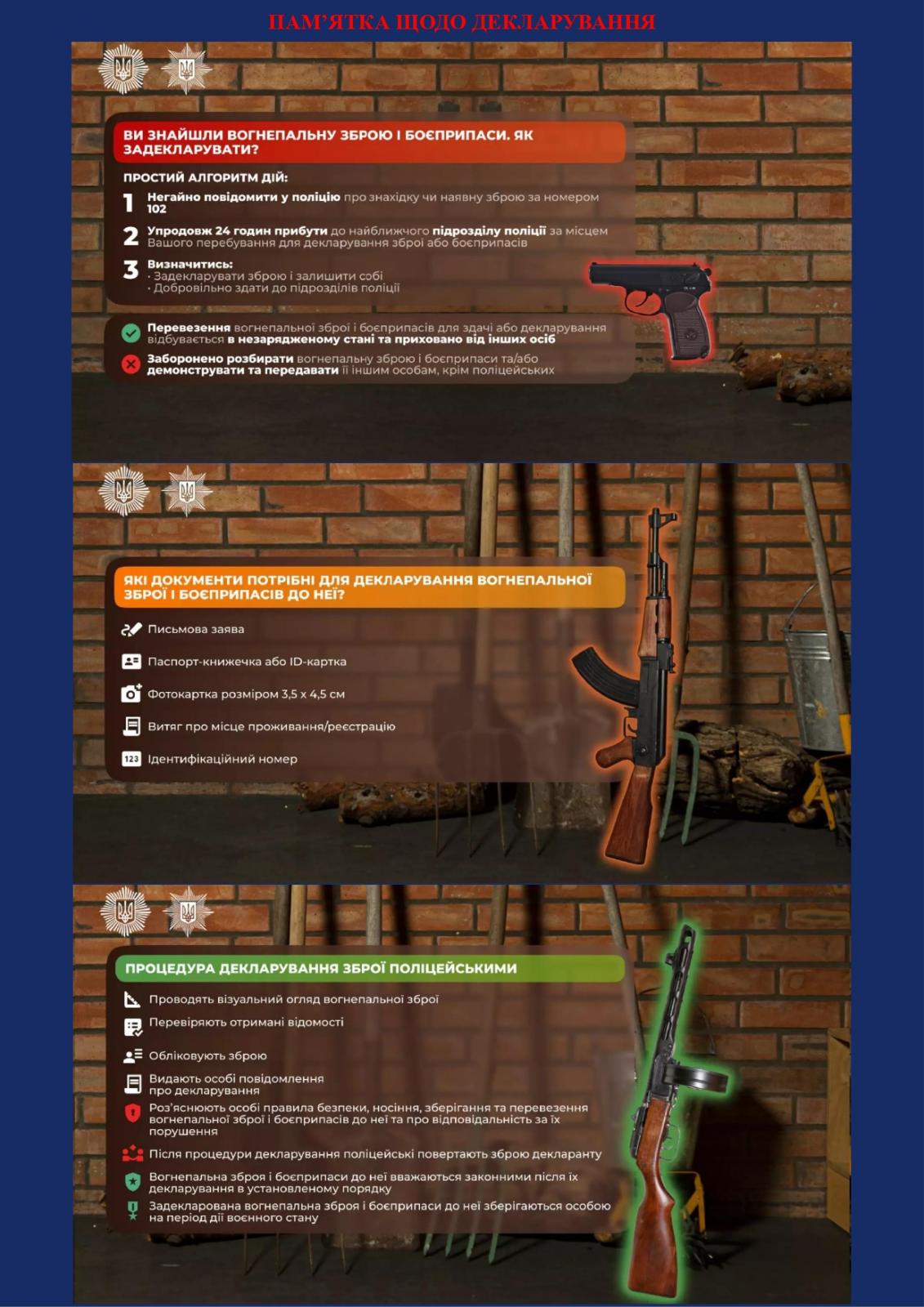 Якщо ви знайшли вогнепальну зброю та боєприпаси до неї, вам необхідно негайно їх задекларувати. Зробити це можна у підрозділах Національної поліції.