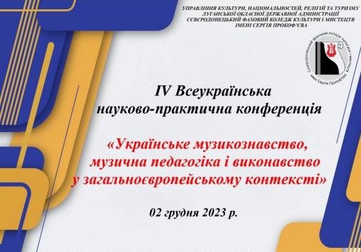 2 грудня 2023 року Сєвєродонецький фаховий коледж культури і мистецтв імені Сергія Прокоф’єва здійснив черговий потужний методичний онлайн захід - ІV Всеукраїнську науково-практичну конференцію «Українське музикознавство, музична педагогіка і виконавство у загальноєвропейському контексті».