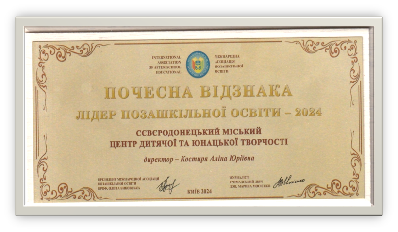 Тож, за підсумками пресконференції: «Позашкільна освіта – 2024: десять звершень» у номінації «Ювілеї позашкільної освіти» Сіверськодонецький міський Центр дитячої та юнацької творчості отримав нагороду – почесну відзнаку «Лідер позашкільної освіти – 2024».