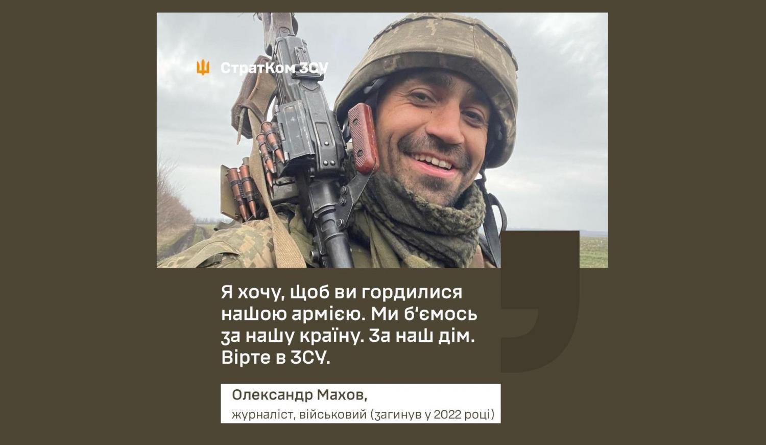 Журналіст телеканалів «Україна», «Україна24», «Дом», ветеран війни на Донбасі, військовослужбовець Олександр Махов віддав життя за країну у бою поблизу Ізюма 4 травня 2022 року.