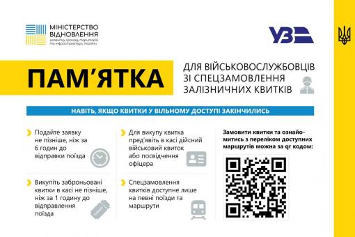 У разі відсутності квитків у вільному продажу, забронювати квиток військовослужбовці можуть онлайн на порталі замовлення сервісних послуг за окремим посиланням .