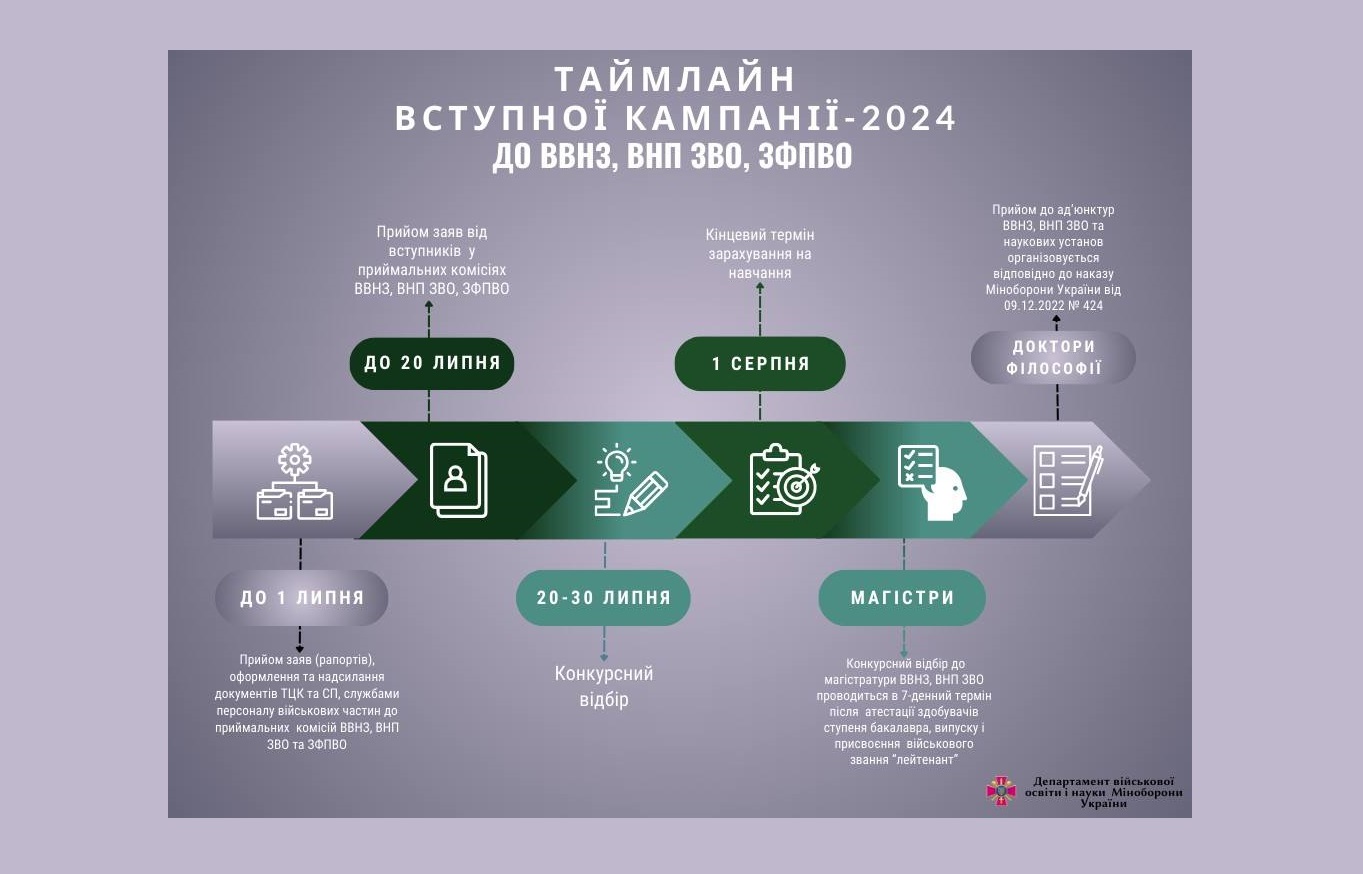 - до 1 липня триватиме прийом заяв (рапортів), оформлення та надсилання документів від територіальних центрів комплектування та соціальної підтримки , служб персоналу військових частин, установ і організацій до приймальних відбіркових комісій вищих військових навчальних закладів, військових навчальних підрозділів закладів вищої освіти та закладів фахової передвищої військової освіти.