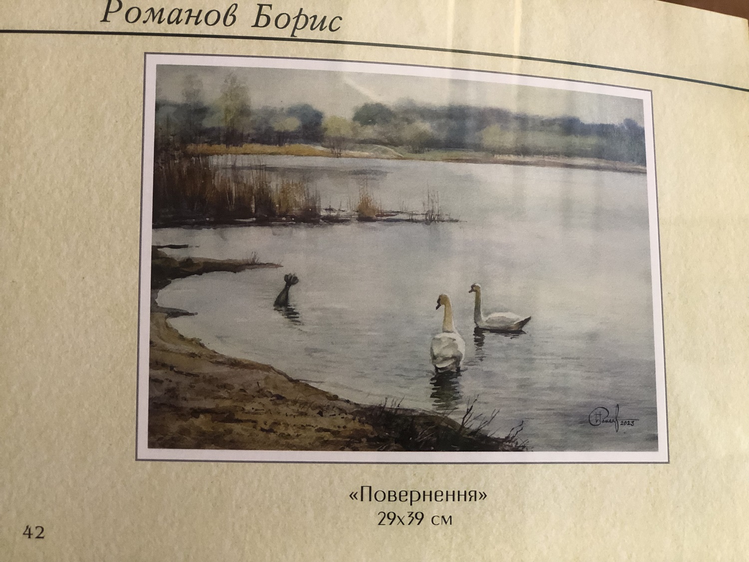 «У мене вже у Дніпрі є кілька тематичних робіт, присвячених Сєвєродонецьку. Зокрема, робота “Повернення”. Тут можна навіть нічого не коментувати: і так все зрозуміло. Це Чисте озеро, куди завжди прилітали лебеді. І зараз прилетіли, але незвично для них: наче, і додому потрапили, але там чужинці. І там міна намальована. Така творча робота. Вони навіть здивовані. Підпливли: що це за “чортяка”? Чому ці люди так себе поводять?»