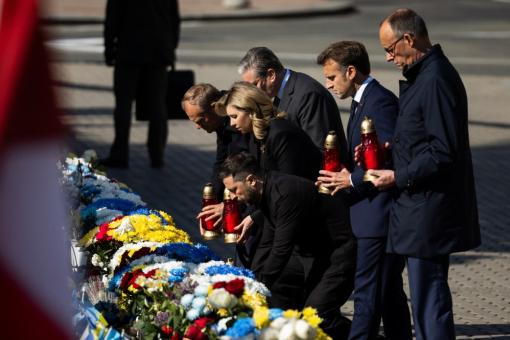 Президент України Володимир Зеленський, перша леді Олена Зеленська, Президент Франції Емманюель Макрон, Прем’єр-міністр Великої Британії Кір Стармер, Федеральний канцлер Німеччини Фрідріх Мерц і Прем’єр-міністр Польщі Дональд Туск на майдані Незалежності в Києві вшанували пам’ять полеглих українських захисників і захисниць.