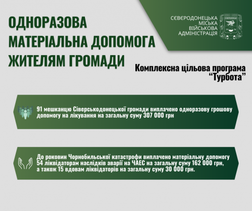 Традиційно відповідною комісією опрацьовано заяви мешканців Сіверськодонецької громади. За результатами розгляду 91 людині призначено та виплачено одноразову грошову допомогу на загальну суму 307 000 грн. Така допомога надається у вигляді відшкодування витрат, понесених людиною внаслідок лікування тяжкої хвороби, отриманого поранення, проведення медичних операцій тощо.