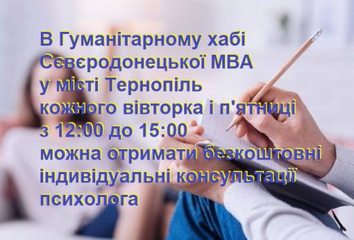 У Сєвєродонецькому гумхабі в Тернополі надаються безкоштовні індивідуальні консультації психолога