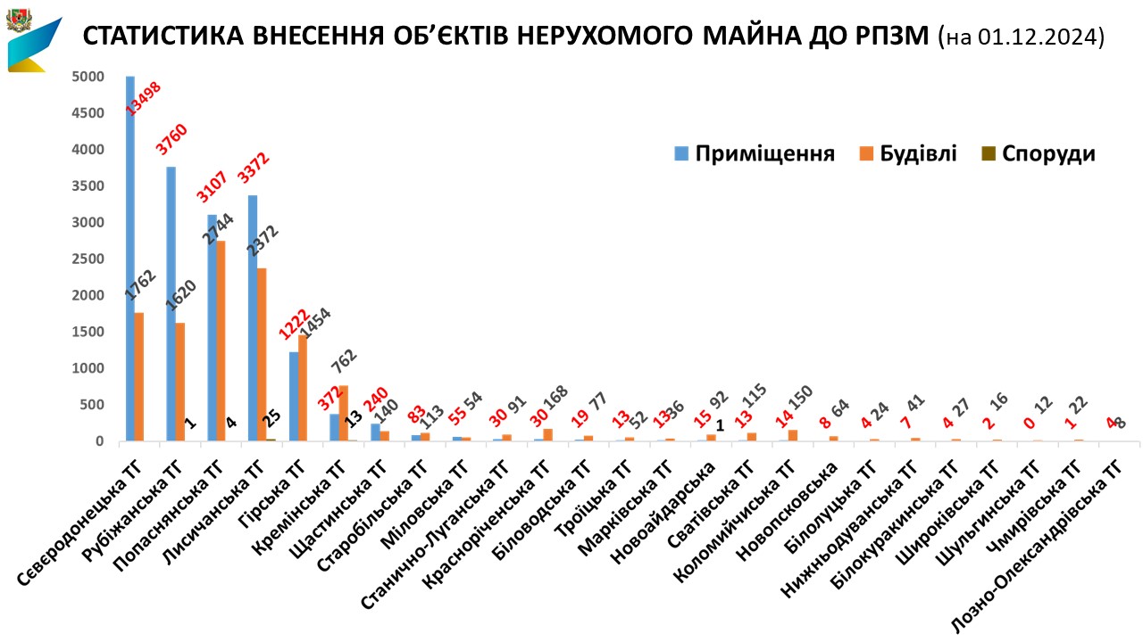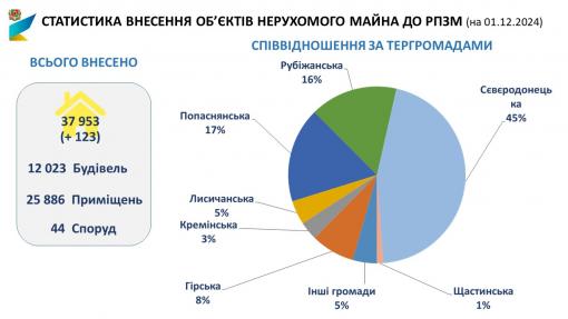 Всього до РПЗМ внесено 37953 об’єктів нерухомого майна (ОНМ) (+123 ОНМ в порівнянні з 01.11.2024) , у тому числі 12023 будівель, 25886 приміщень, 44 споруди.