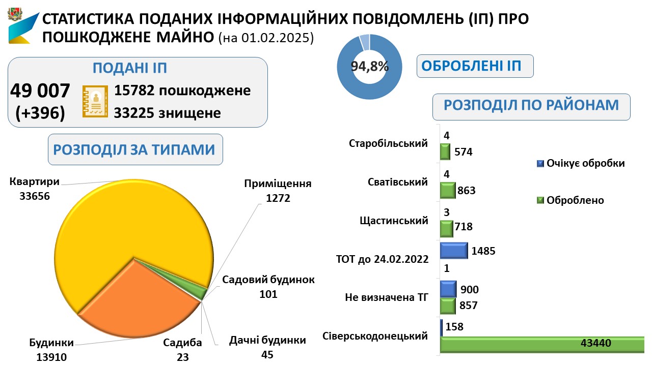 Департамент економічного розвитку та зовнішньоекономічної діяльності ЛОДА інформує, що станом на 01.02.2025 громадянами області подано 49007 інформаційних повідомлень (ІП) (+396 ІП в порівнянні з 01.01.2025) про пошкоджене/знищене нерухоме майно.