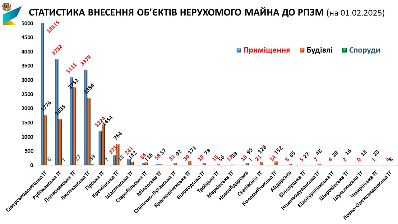 Всього до РПЗМ внесено 38148 об’єктів нерухомого майна (ОНМ) (+93 ОНМ в порівнянні з 01.01.2025) , у тому числі 12127 будівель, 25927 приміщень, 94 споруди.