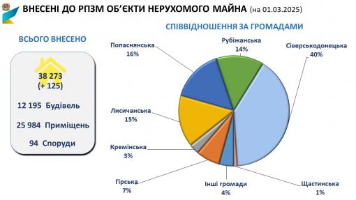 Всього до РПЗМ внесено 38273 об’єкта нерухомого майна (ОНМ) (+125 ОНМ в порівнянні з 01.02.2025), у тому числі 12195 будівель, 25984 приміщень, 94 споруди.