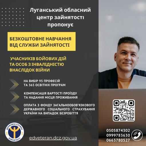 Для підвищення конкурентоспроможності на ринку праці, та подальшого працевлаштування ЛУГАНСЬКИЙ ОБЛАСНИЙ ЦЕНТР ЗАЙНЯТОСТІ пропонує навчання учасникам бойових дій та особам з інвалідністю внаслідок війни в закладах професійно-технічної  освіти Державної служби зайнятості