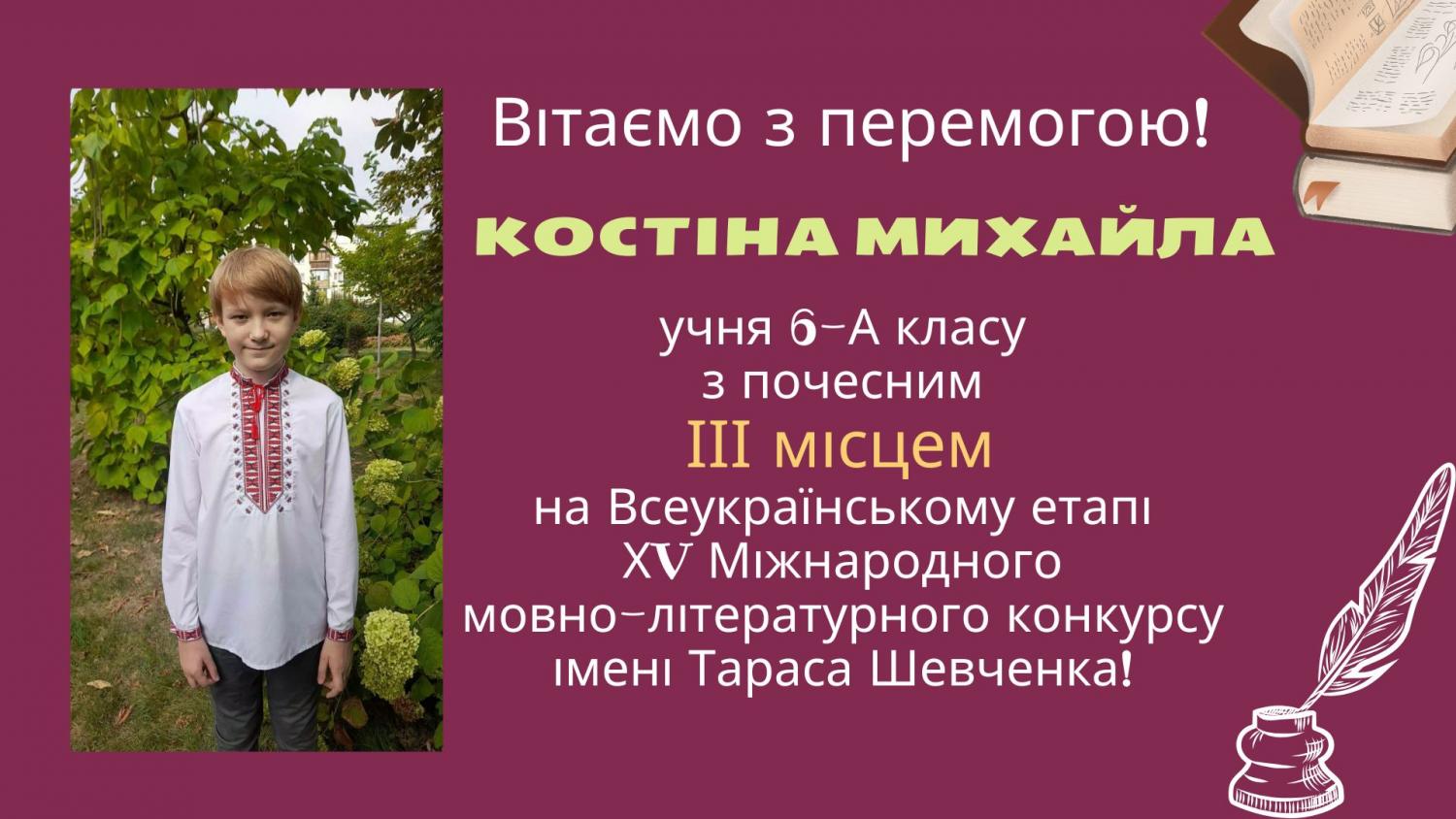 Щиро вітаємо Михайла Костіна, учня 6 класу Ліцею "ЮВЕНЕС" міста Сєвєродонецька, з почесним ІІІ місцем на всеукраїнському етапі ХV Міжнародного мовно-літературного конкурсу імені Тараса Шевченка!
