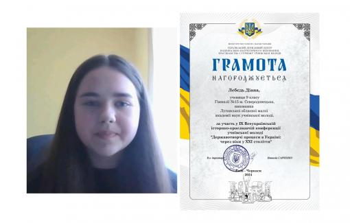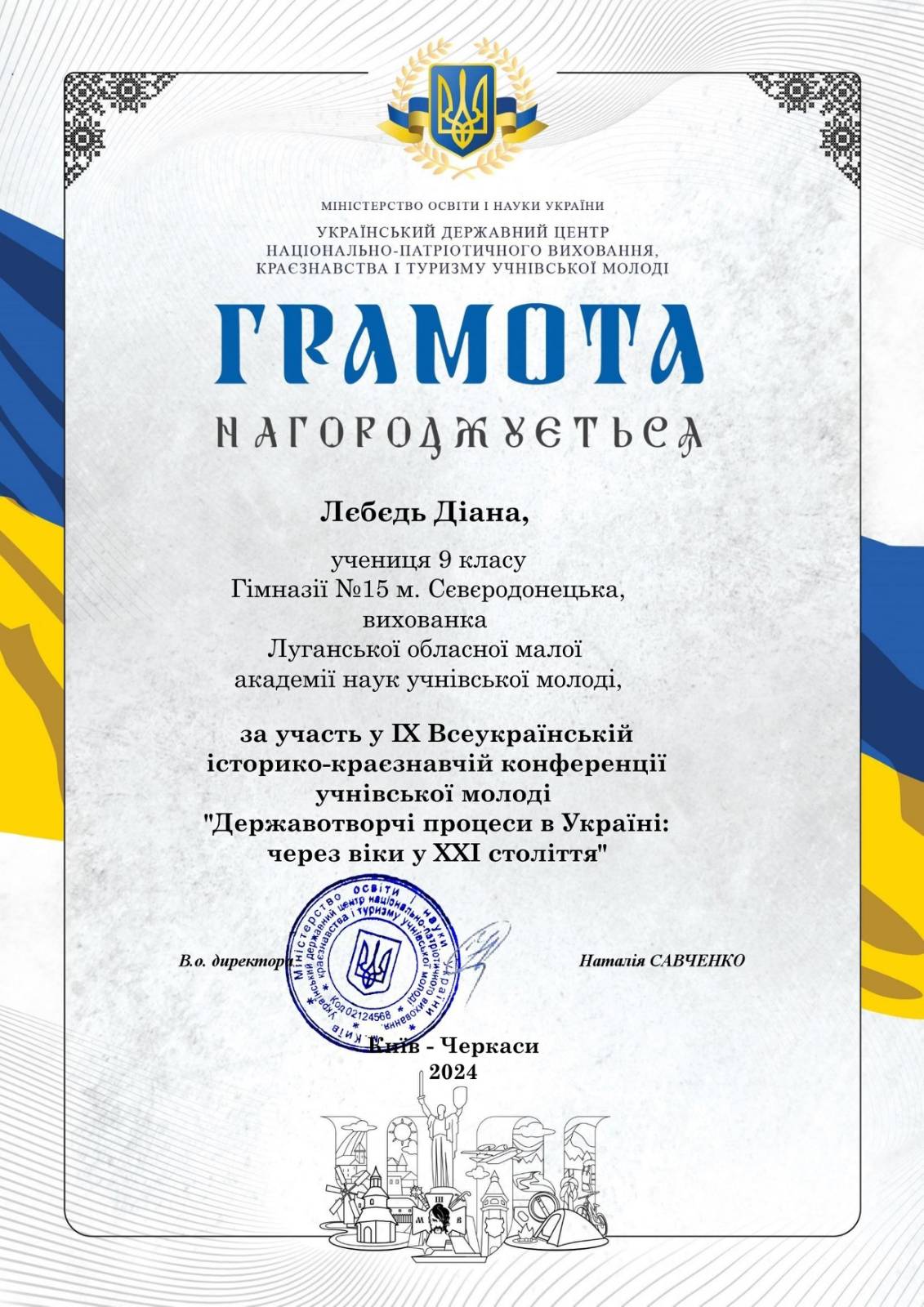Ученицю Гімназії №15 м.Сєвєродонецька Діану Лєбєдь відзначено Українським державним центром національно-патріотичного виховання, краєзнавства і туризму учнівської молоді