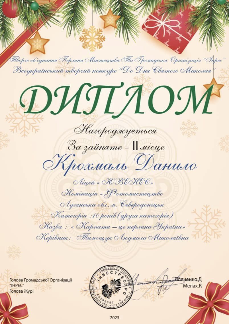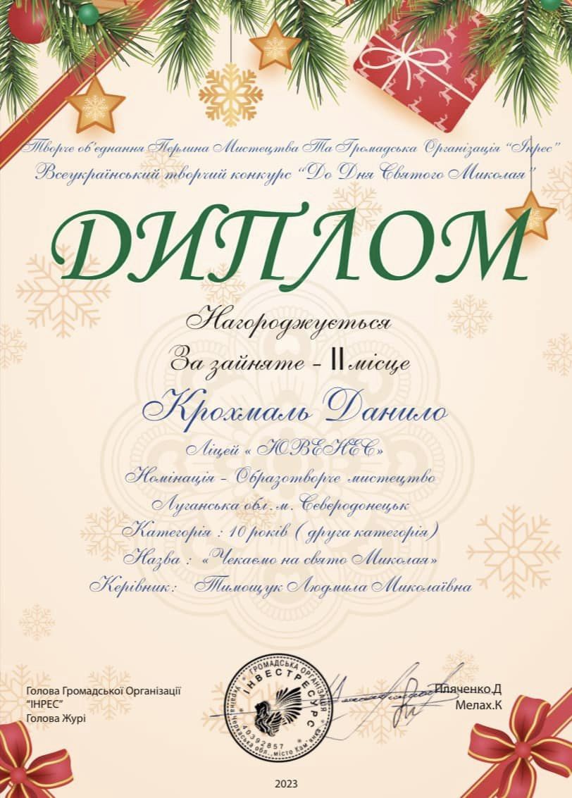Учні ]]>Ліцею "ЮВЕНЕС" міста Сєвєродонецька]]> прийняли участь у Всеукраїнському творчому конкурсі «До Дня Святого Миколая» та здобули на ньому призові місця: