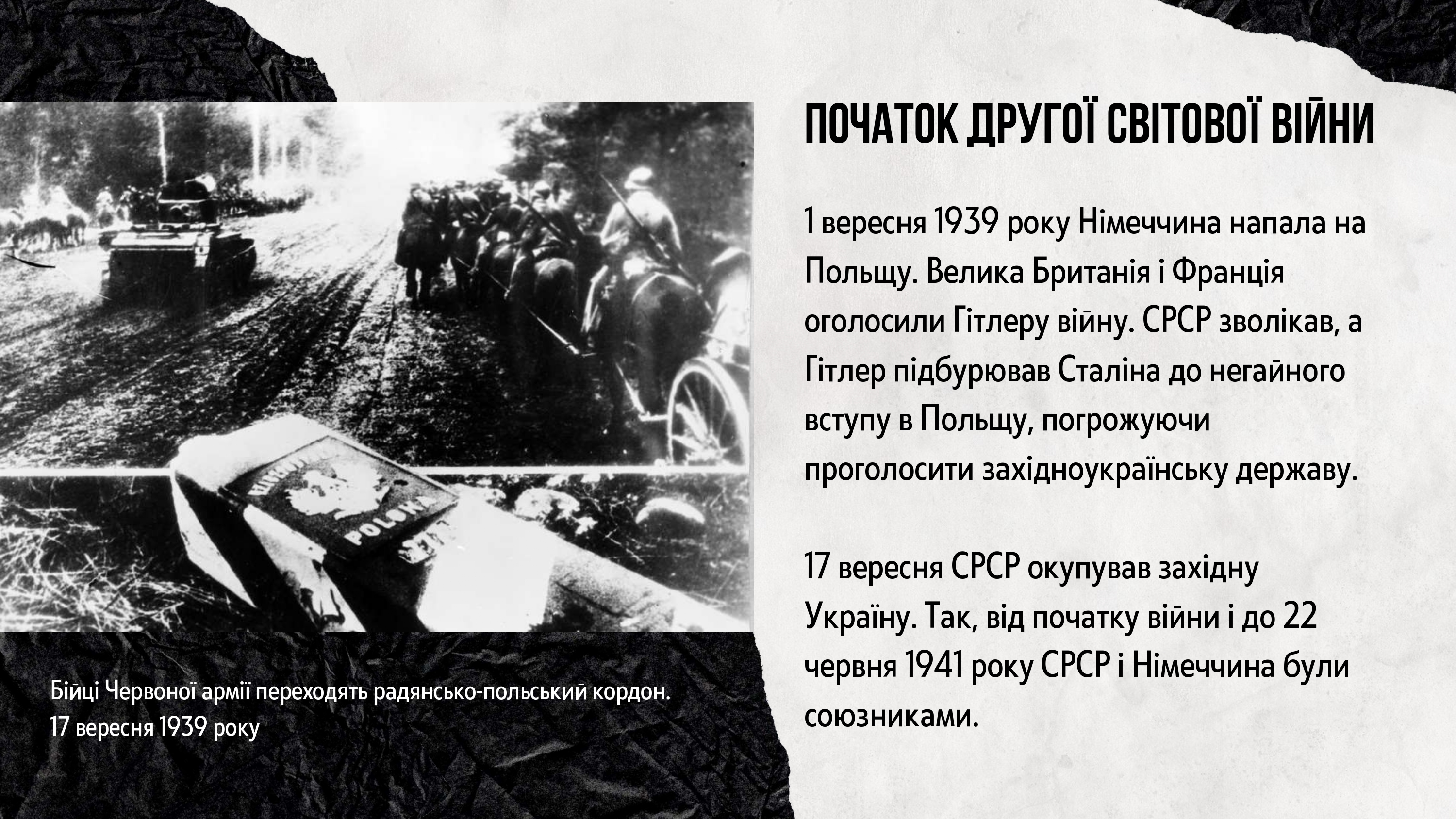 Друга світова розпочалася для України нападом нацистської Німеччини на Польщу 1 вересня 1939 року і бомбардуванням німецькою військовою авіацією Львова та інших наших міст. А з 22 червня 1941-го після вторгнення військ Німеччини та її союзників на територію СРСР уся Україна стала ареною запеклих бойових дій.