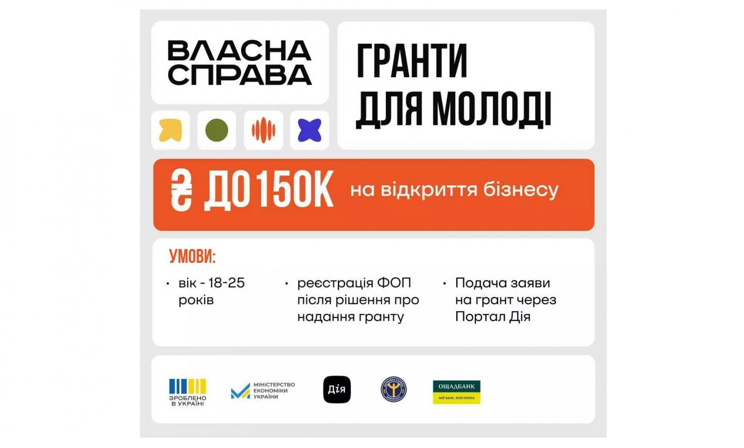 Гранти розміром до 150 тисяч гривень із зобов’язанням зареєструватись ФОП зможуть отримати молоді підприємці віком до 25 років. Водночас вимога створити робочі місця для них буде не обов’язковою.