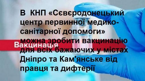 В КНП «Сєвєродонецький центр первинної медико-санітарної допомоги» можна зробити вакцинацію від правця та дифтерії у містах Дніпро та Кам'янське