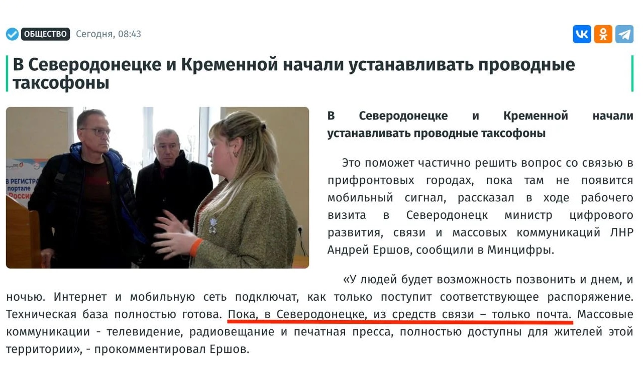 Днями "міністр лнр" Єршов відвідав Сєвєродонецьк, щоб похвалитися встановленням у місті дротових таксофонів. За словами колаборанта, місцеві мешканці тепер зможуть дзвонити і вдень, і вночі, щоправда, водночас він не уточнив, кому саме, адже переважна більшість мирних жителів покинули Сєвєродонецьк ще 2022 року.