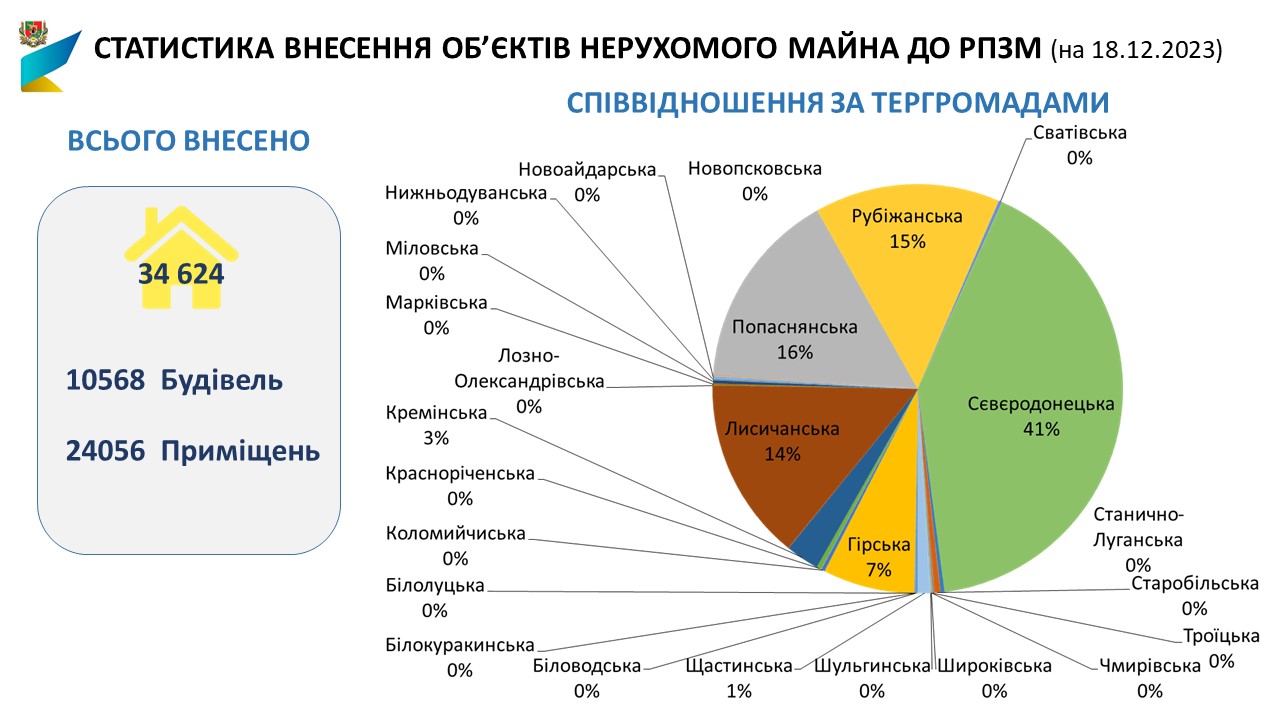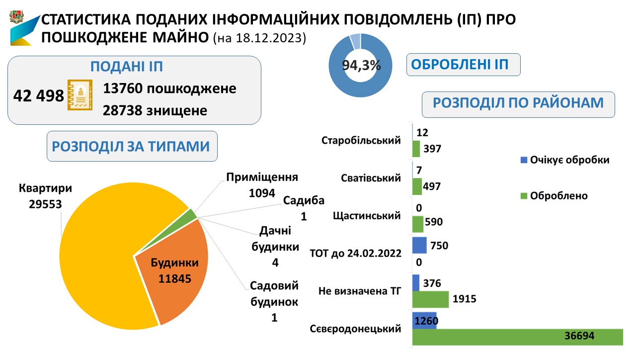 Станом на 18.12.2023 в Луганській області подано 42498 інформаційних повідомлення (ІП) про пошкоджене/знищене нерухоме майно.