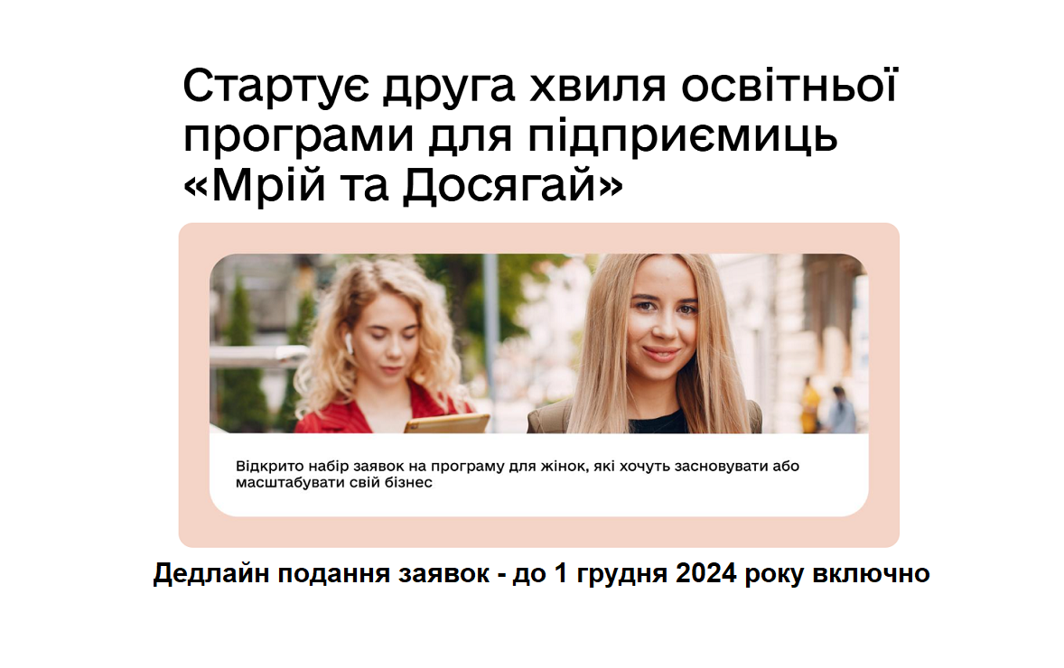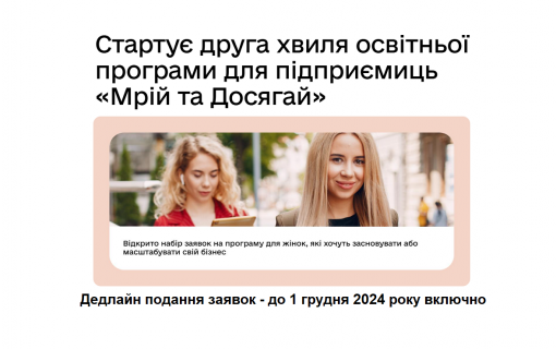 Розпочинається друга хвиля освітньої програми «Мрій та Досягай» . Програма покликана допомогти постраждалим від війни жінкам здобути знання для створення і просування власного бізнесу в онлайн-середовищі, а також переведення офлайн-бізнесів в онлайн-формат.