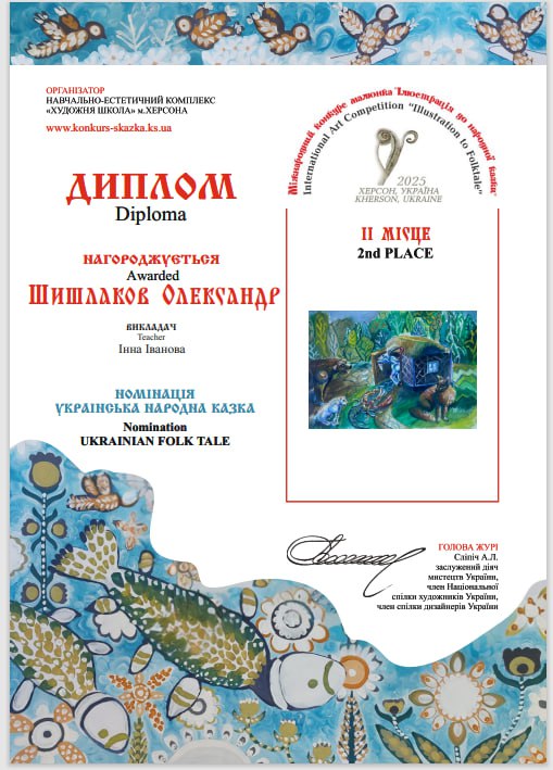Вітаємо Шишлакова Олександра - призера Міжнародного конкурсу малюнку. Його робота посіла ІІ місце у номінації “Українська народна казка”. Викладач Інна Іванова.