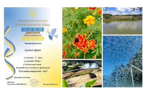 Від закладів освіти Сєвєродонецької міської територіальної громади за активну участь та високу якість виконання творчих робіт, на підставі наданих звітних матеріалів, відповідно до рішення журі нагороджено Дипломами Незламності Луганського обласного центру еколого-натуралістичної творчості учнівської молоді переможців І (обласного) етапу Всеукраїнського юнацького фестивалю «В об’єктиві натураліста – 2024» учасників, які посіли призові місця: