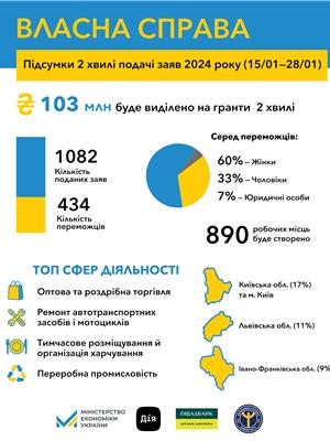 «434 переможці другої у 2024 році хвилі грантової програми «Власна справа» отримають від держави 103 млн грн на старт або розвиток свого бізнесу. При цьому ці підприємці створять майже 1 000 робочих місць. Від початку дії програми в липні 2022 року маємо вже 14 000 грантоотримувачів, в бізнес яких держава інвестує 3,3 млрд грн. Завдяки цим інвестиціям з’явились тисячі нових підприємств, діючі компанії розширили свою діяльність, збільшили обсяги виробництва й асортимент продукції або послуг, освоїли нові напрями. Окрім того, отримувачі грантів загалом створять понад 30 тисяч нових робочих місць”, - повідомила заступник Міністра економіки України Тетяна Бережна.