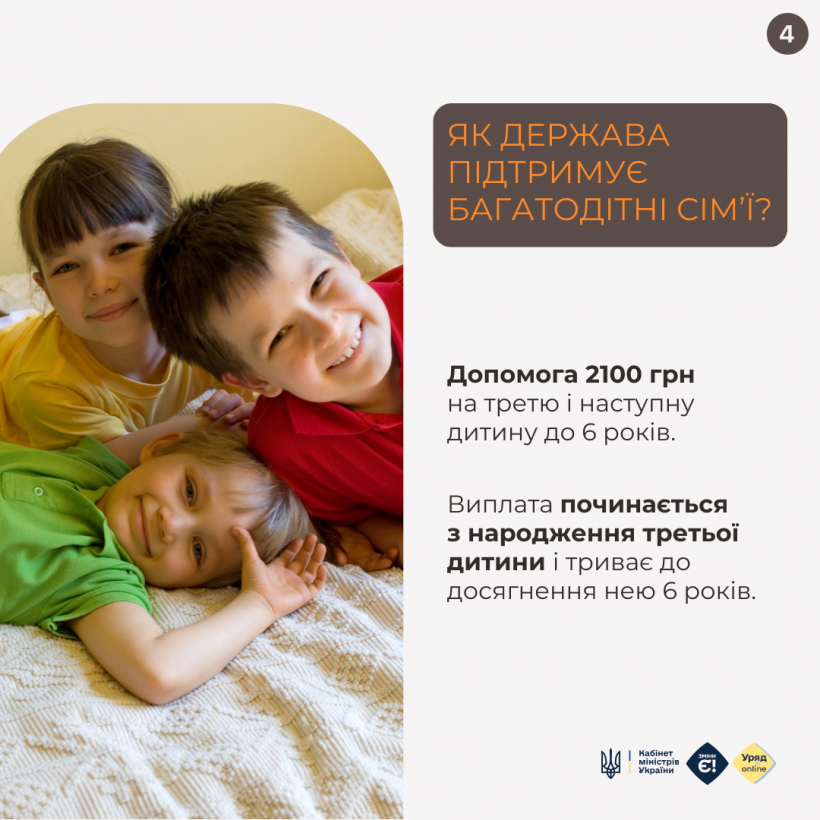 Крім того, держава надає щомісячну допомогу у розмірі 2100 гривень на третю та наступну дитину до 6 років.