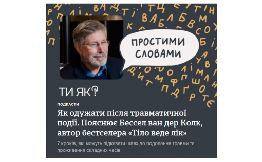 Як вийти з такого стану та що допомагає долати травматичний досвід і залишатися стійкими навіть у найскладніші часи, він розповів у другому епізоді нового сезону подкасту «Простими словами», що виходить в межах Всеукраїнської програми ментального здоров’я «Ти як?». Натомість професор ван дер Колк наголошує, що до його порад варто ставитися критично, адже він зараз перебуває в безпеці й не знає напевне, що спрацює саме для нас.