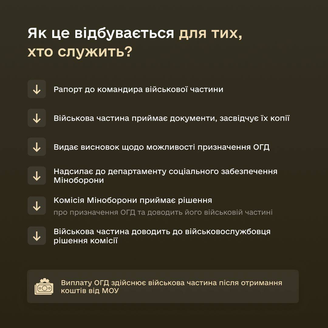 Тим, хто служить, потрібно подати відповідний рапорт до командира військової частини. Після цього військова частина приймає документи та засвідчує їх копії, видає висновок щодо можливості призначення ОГД, а потім надсилає до департаменту соціального забезпечення Міноборони. Комісія Міноборони ухвалює рішення про призначення ОГД та доводить його військовій частині. В свою чергу, військова частина доводить до військовослужбовця рішення комісії та здійснює виплату ОГД після отримання коштів від Міноборони.